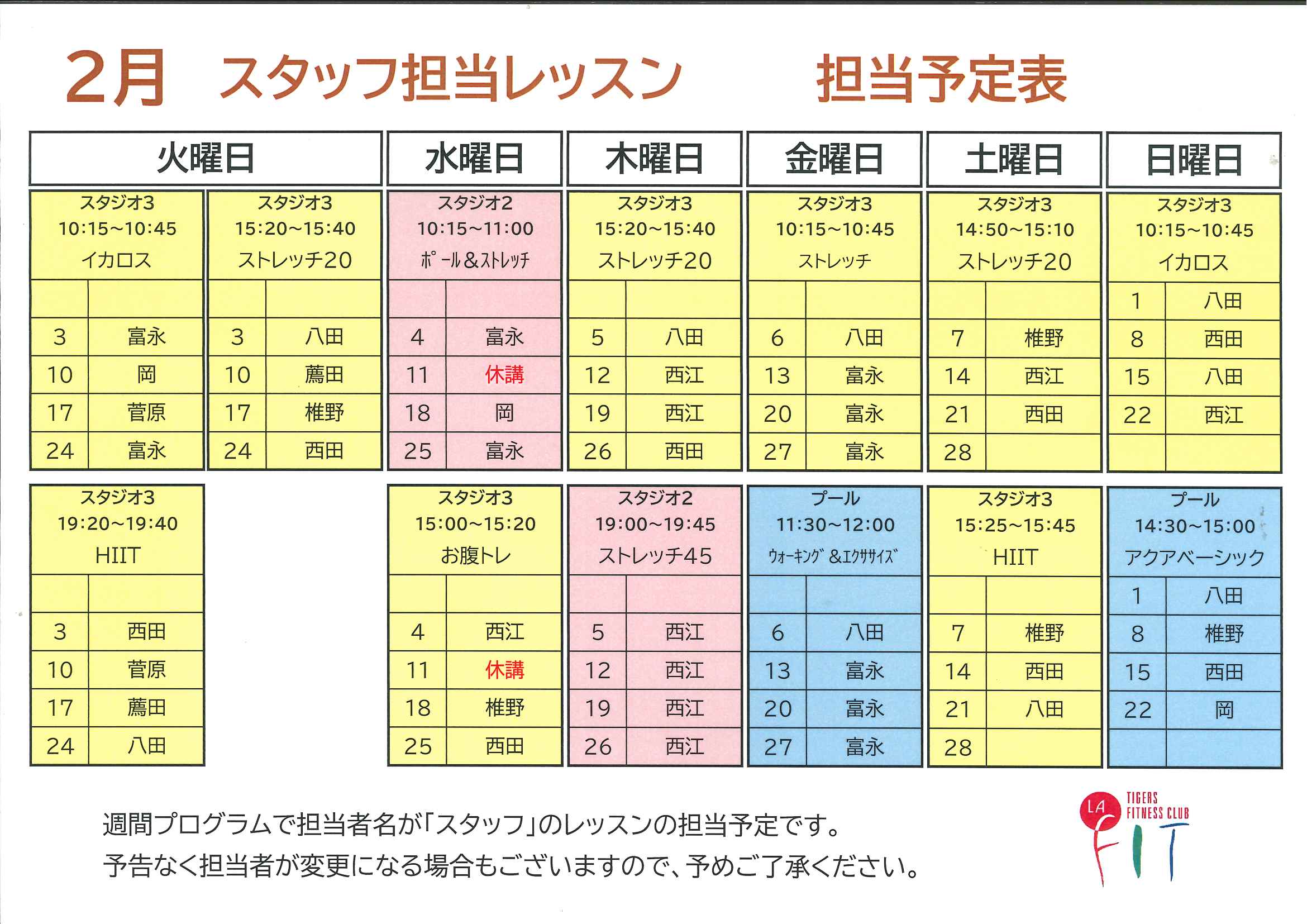 2月度スタッフ担当レッスン予定表