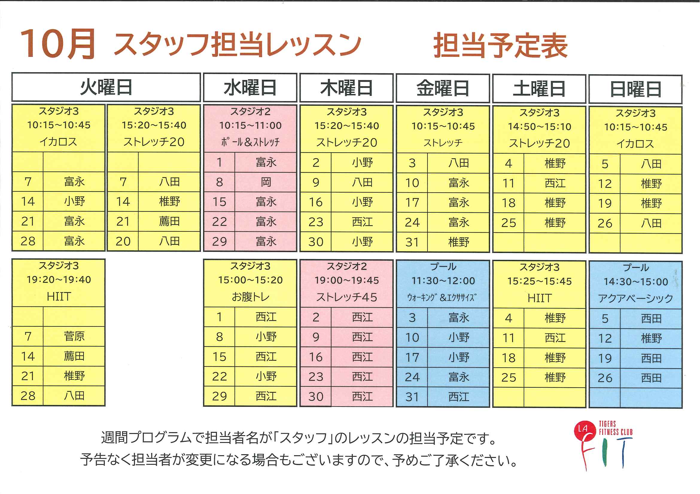 10月スタッフ担当レッスン予定表