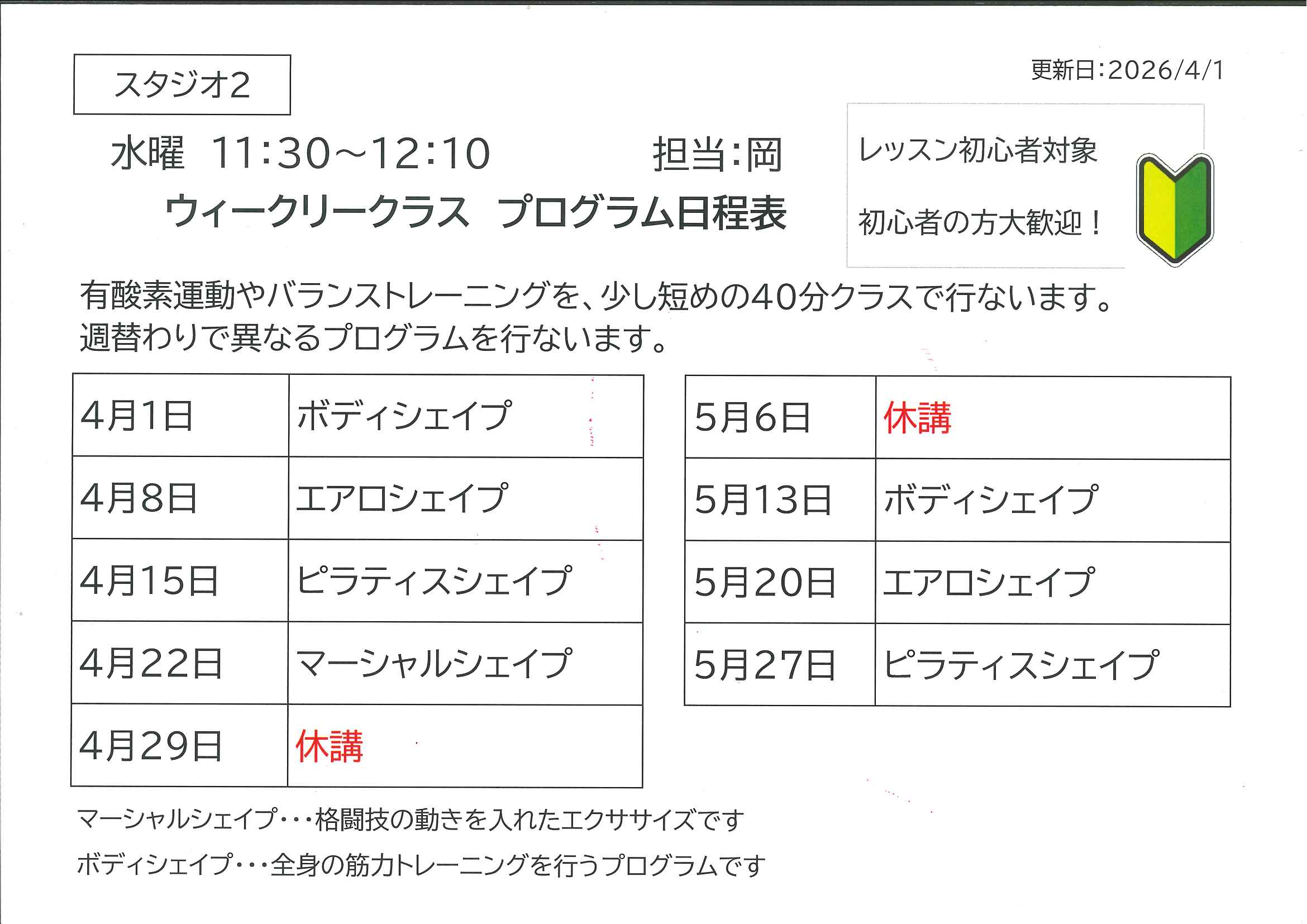 4月&5月ウィークリークラスご案内