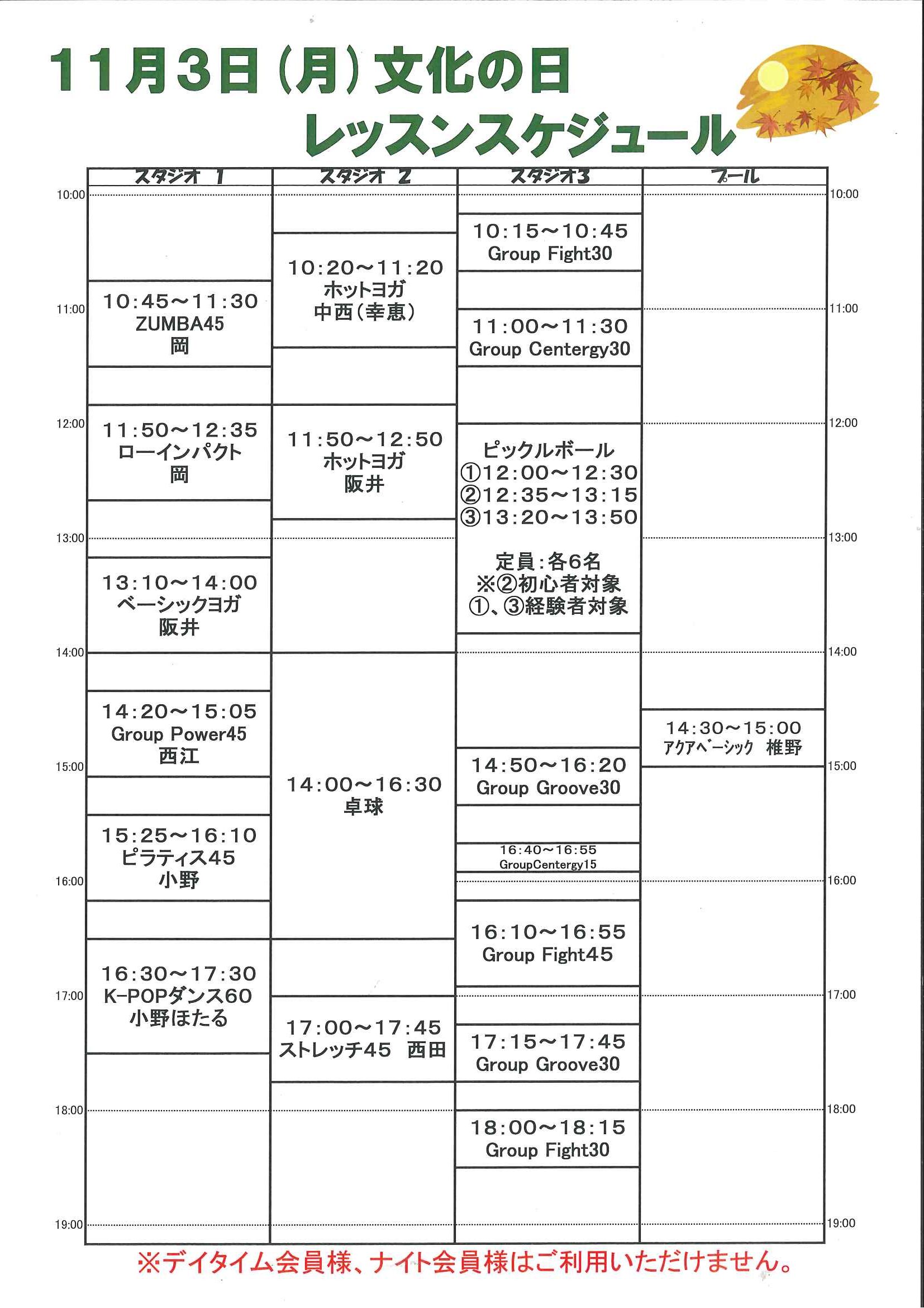 11月3日(月・祝)特別レッスンタイムスケジュール